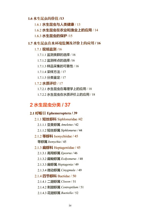 该书收录水生昆虫中蜉蝣目、祯翅目、毛翅目、蜻蜓目、半翅目、鳞翅目、广翅目、鞘翅目、双翅目共9目83科246属388种,并附以实物图片372幅,从常见度、形态特征、地理分布、生境与应用价值等方面,对不同属、种水生昆虫进行了详细的检索描述,鉴定种类简洁直观。