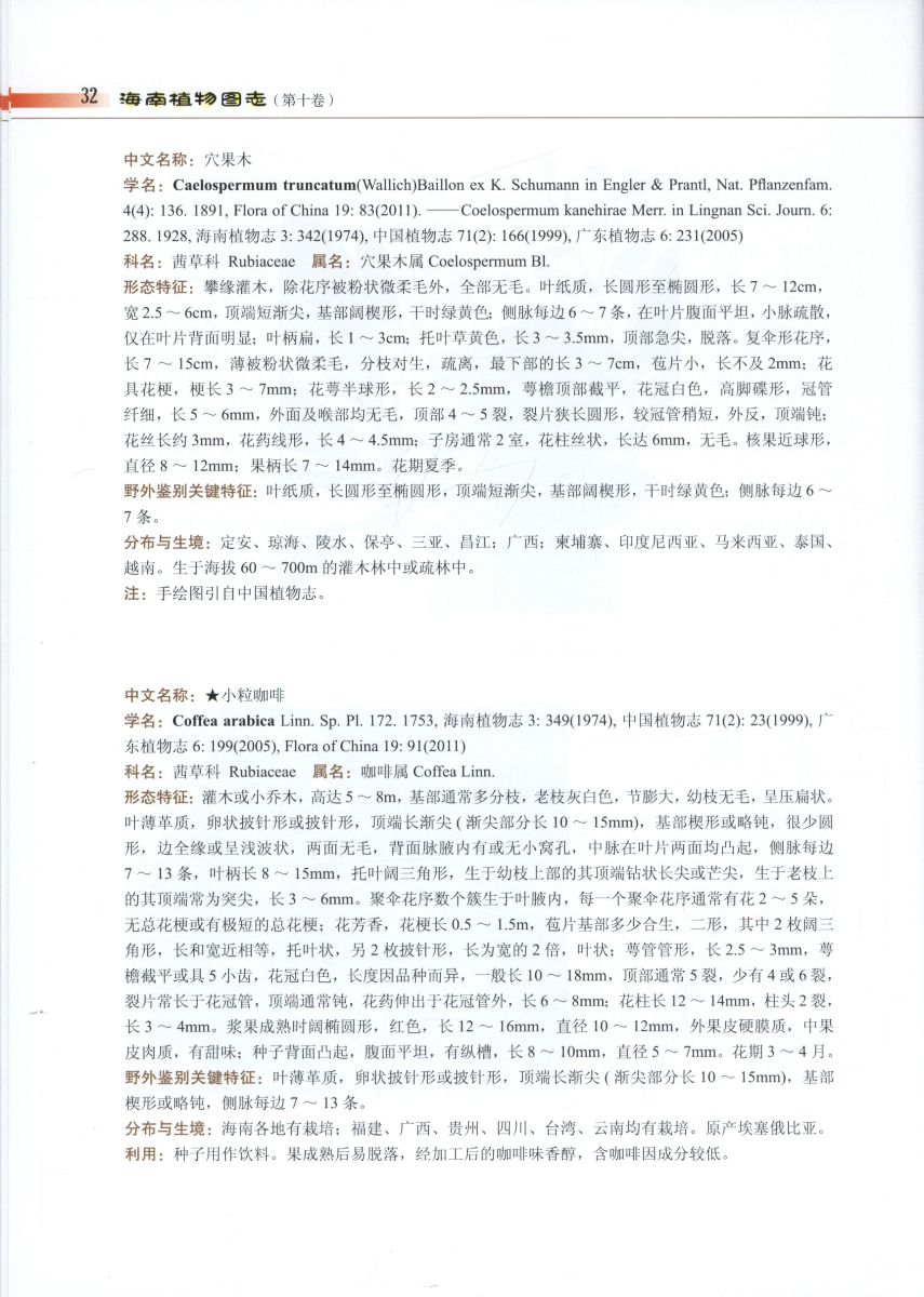 Illustrated Book of Plants from Hainan (Hai Nan Zhi Wu Tu Zhi) Vol.10,《海南植物图志》收录了海南有历史记录的植物(维管束植物)6036种,隶属243科1895属。共有木本植物2781种,草本植物2773种,藤本植物482种。蕨类植物共计33科127属516种,裸子植物共计9科24属76种,被子植物共计201科1744属5444种。其中,海南本地野生植物4679种(海南特有植物483种),外来栽培植物1294种,外来逸生及归化植物163种(其中外来入侵植物57种)。《海南植物图志》共分十四卷,第一卷为蕨类植物,第二卷至第十一卷为裸子植物和双子叶植物,第十二卷至第十四卷为单子叶植物。本图志的每一卷文中的野外鉴别关键特征和附录中的海南植物各科的野外经验检索,可为读者查阅所拍摄到的图片或采集到的标本所属科的野外初步鉴定提供参考。