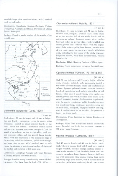 All the significant specimens stored in the Institute of Oceanology, Chinese Academy of Science, Qingdao, are illustrated in colour photographs, except for a few colour paintings employed especially for those shell-less animals. About 50 holotype specimens are shown in full colour for the first time. Each species is described in external morphology, colour, texture, geographical distribution and, when necessary for identification, also internal structure and reproductive characteristics. Unless otherwise specified, most of the shell sizes are taken from those of the photographed specimens. A total of 75 maps are attached to the species distribution of about 200 common species, serving as aids in tracing their distribution of about 200 common species, serving as aids in tracing their distribution ranges or localities where they were found.