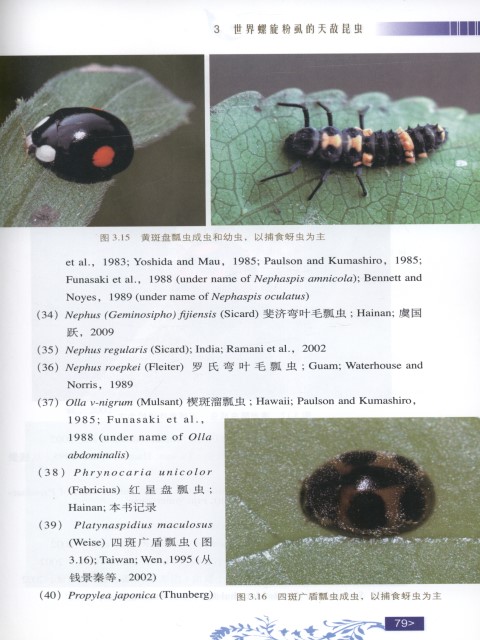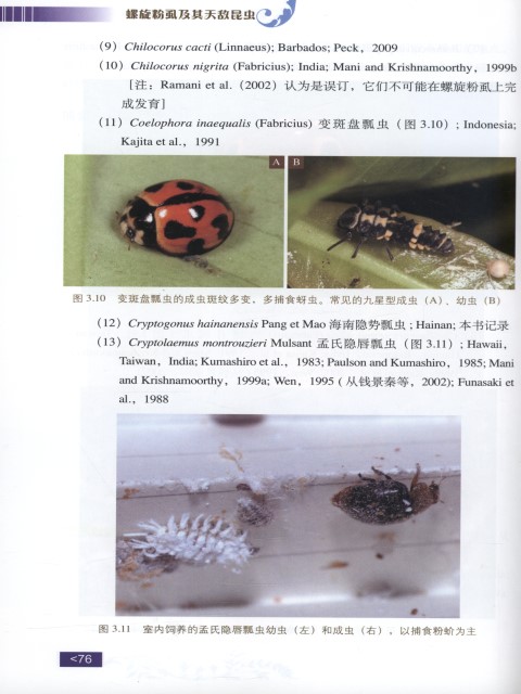 The spiraling whitefly, Aleurodicus disperses Russell, was first recorded from tropical Central and South America, but it is not an important pest there. The incidence of the pest was first noticed on guava in 1988 in Taiwan and in 2006 in Hainan. When discovered, it almost spreaded the whole islands. A total of 284 host plants belonging to 81 families was recorded from China (144 host plants from Taiwan and 184 from Hainan). It occurs mainly on ornamentals, fruit trees and crops. At present, it has not invaded the Chinese mainland. The book introduced its economic importance, morphology and biology, lists 110 natural insect enemies (including spiders and parasitic mite), describes 24 natural insect enemies from Hainan, provided with color pictures, reviews the biological control by using the most important predators and parasitoids, and finally discusses the prospective of its control by natural enemies and application measures, laying emphasis on utilization of the incidentally introduced parasitoid Encarsia guadeloupae and protection of biodiversity. The appendix lists 743 host plants of 109 families in the world, provided with species names, distribution and cited literatures.